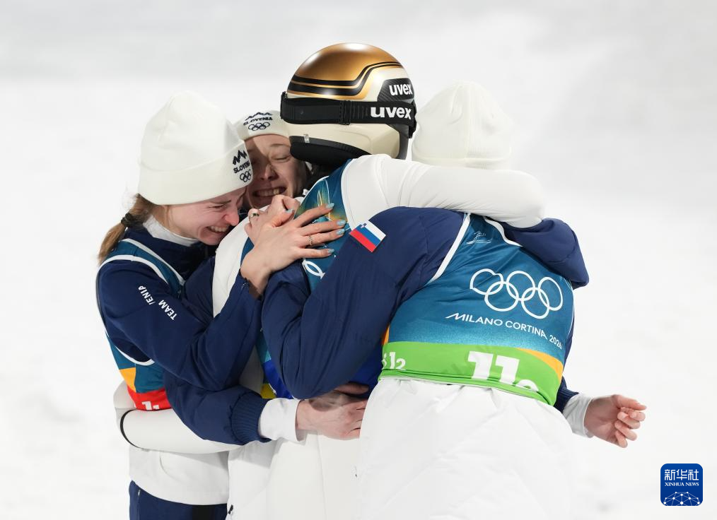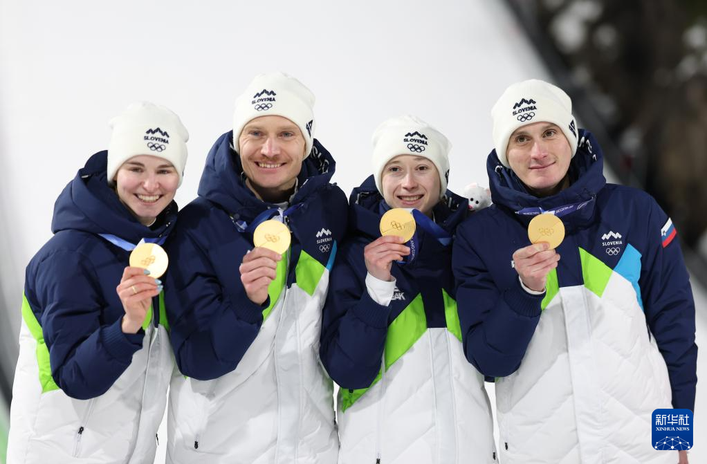 2月10日,斯洛文尼亚队选手多门·普雷夫茨和队友交流。斯洛文尼亚队夺得冠军。